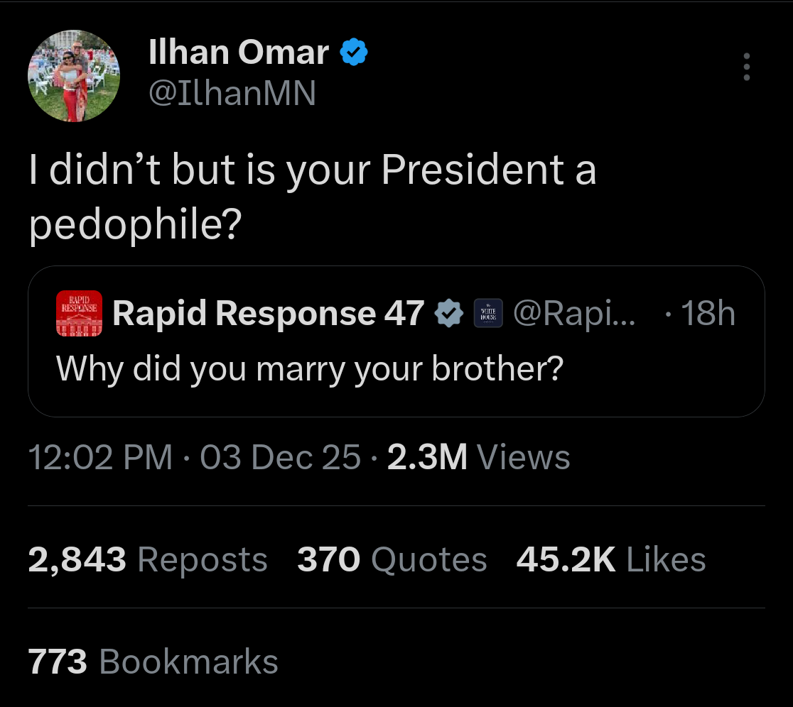 >>522793150On Xitter, I made a joke about putting ilhan omar on a rocket and firing it into the sun, they were gonna ban me for hate speech for 7 days and I appealed and it wasn't even an hour before it was lifted