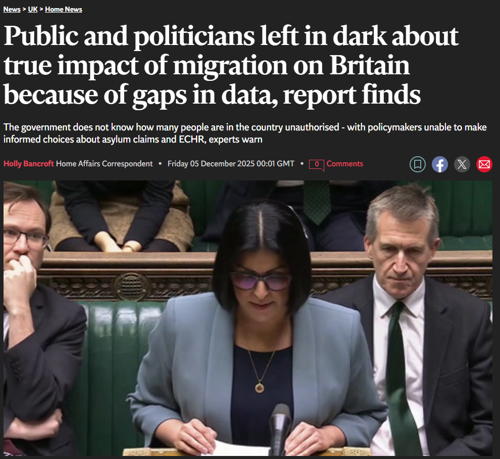 >Rising racism blamed for collapse in number of foreign nurses coming to UKhttps://www.theguardian.com/society/2025/dec/05/collapse-in-number-of-overseas-nurses-coming-to-uk>Public and politicians left in dark about true impact of migration on Britain because of gaps in data, report findshttps://www.independent.co.uk/news/uk/home-news/migration-data-asylum-refugees-home-office-b2877967.html