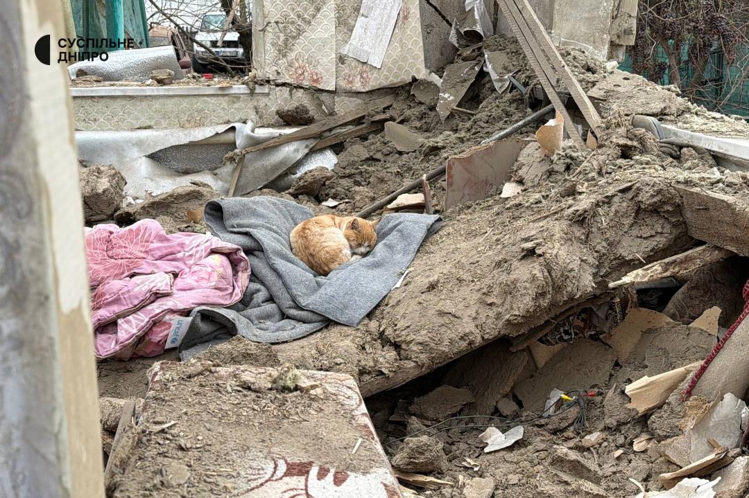 >A cat sleeps on the rubble of a destroyed house where russian niggers killed a 12-year-old child with a drone at night.