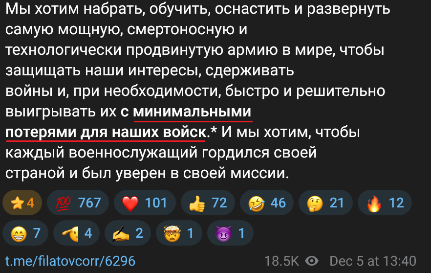 Filatov wrote a wishlist for what magical poccnr should become. Last paragraph:>We want to recruit, train, equip, and deploy the most powerful, lethal, and technologically advanced military in the world to defend our interests, deter wars, and, if necessary, win them quickly and decisively with minimal casualties to our troops.* And we want every service member to be proud of their country and confident in their mission.Why is "minimal casualties for our troops" in bold? rly makes the noggin go jogginhttps://t.me/filatovcorr/6296