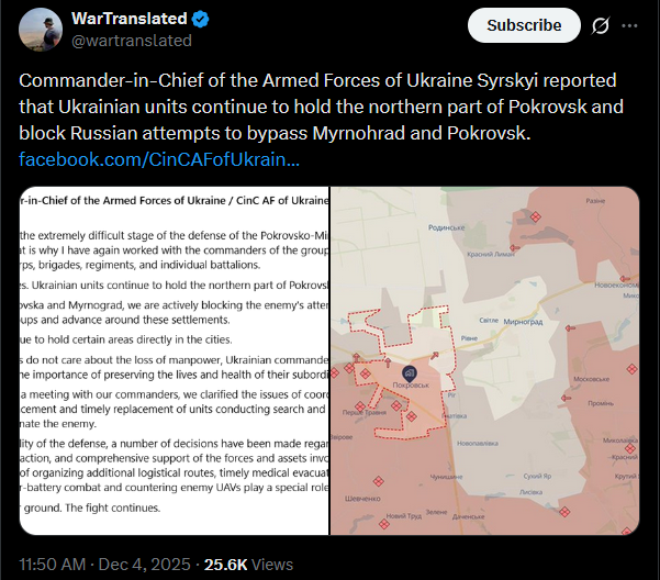 Previous: >>522941105Day 1,381 – Daily assessment: https://understandingwar.org/analysis/russia-ukraine/#research▶Latest>Russia says Ukrainian attack caused fire at Azov Sea port of Temryuk> Syzran Oil Refinery in Samara Hit by Ukrainian Drones>russian forces pushed to the Northern outskirts of Kupyansk>russian general admits that the war has not gone according to plan, and was surprised to find that the Ukrainians did not greet them as liberators>160k+ named and verified dead vatniggers t. Gorushko>Fourth pidor tanker sinking, company ceasing all operations in russia in response>Germany's Lt Gen Freuding says comms with Pentagon cut-off>Novorossiysk port is closed due to AIDS>Ukrainian forces successfully used the Sting interceptor drone to down russian jet-powered long-range drones>Another russian shadow fleet tanker sinking under its own power (this time near Senegal)>russia loses ability to send people into space after another disastrous failure>Ukis advance in the Lyman direction>The russian, "bunny ears" offensive has now concluded, resulting in a total russian defeat>Ivanivka has been liberated>Ukrainian forces struck overnight Afipsky refinery, Beriev aircraft plant in Taganrog where Tu-95 bombers are modernized sparking fire in the repair shop, and destroyed a 5000-cubic-meter tank at Tuapse oil terminal, General Staff reported▶Telegramhttps://rentry.org/telosint2023https://t.me/ukr_pics▶Intelhttps://t.me/DeepStateENhttps://odin.tradoc.army.mil/WEG (equipment explorer)https://ukr.warspotting.net (visually confirmed losses)▶Mapshttps://deepstatemap.live/enhttps://liveuamap.com/en▶DISPOSABLE SOLDIER (diary of a RU mobik)TOUR 1: files.catbox.moe/34fuhc.txtTOUR 2: files.catbox.moe/uj2wut.txtTOUR 3: files.catbox.moe/hmyd98.txtTOUR 4: files.catbox.moe/cdenxe.txt▶12 min vid of ziggerdeath in one ditch (Pokrovsk area) 28 killedhttps://files.catbox.moe/sxbxfb.mp4 (embed) (embed) (embed)