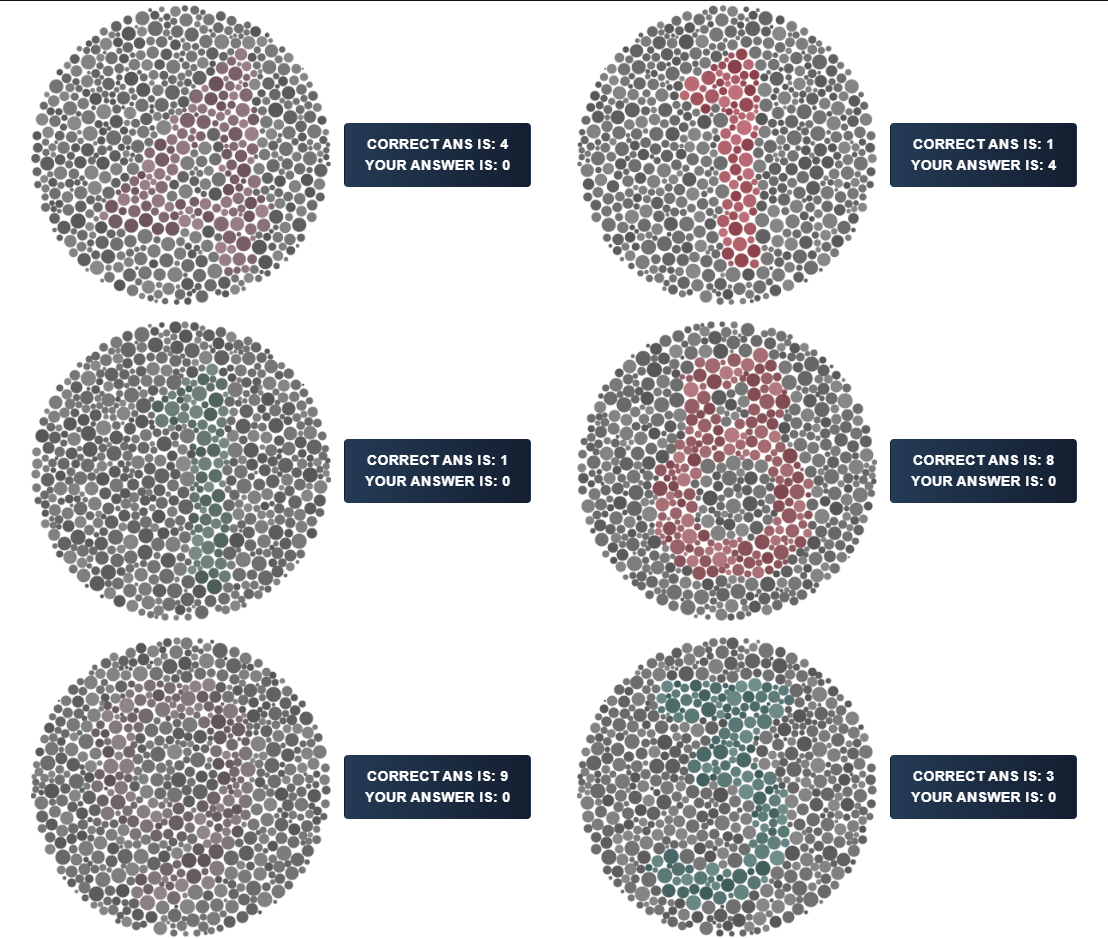 >>523186161What the fuck is this shit, it's all grey, i had to skip them.Minor color blindness, cannot differentiate from grey red to grey green. It has to be moderate i guess.