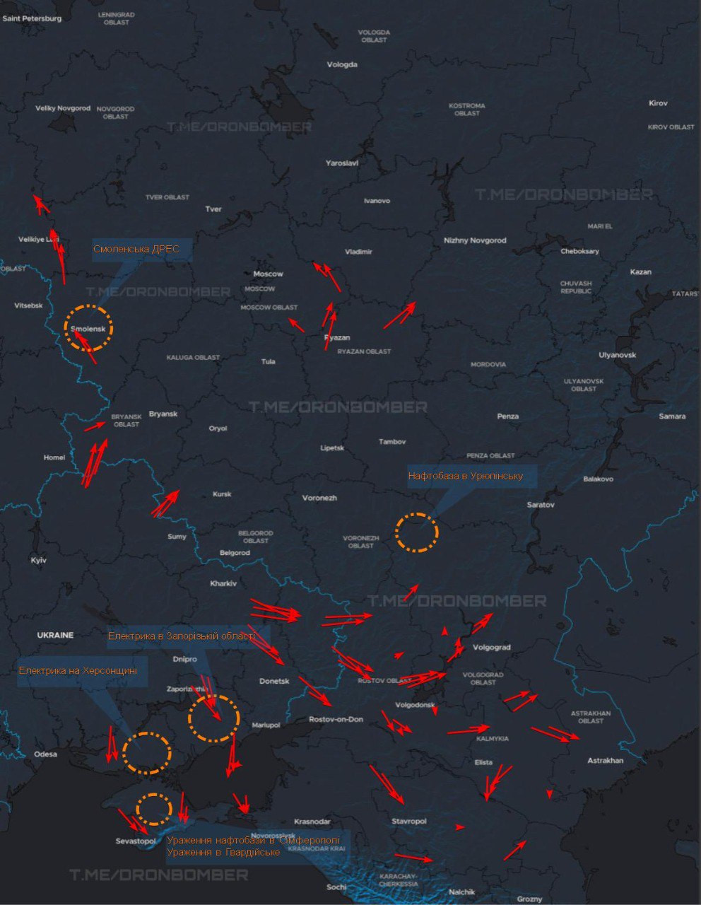 23:35 | 13 / 12 (second wave)Approximate flight routes of our UAVs:Red Arrow – directions of movement of strike UAVs;Red circle-damage recorded during map publication;All information about routes is taken from Russian sources.