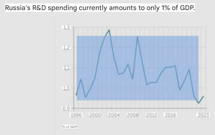 >According to Klepach's report, last year less than 1% of GDP was allocated to R&D in the country. In the pre-war years, this figure was between 1% of GDP and 1.1% of GDP, and at its peak, in the mid-2000s, it reached 1.3% of GDP. Since then, funding for scientific development has decreased by a quarter, and its current levels are even lower than the values of the 1990s, when the country was dealing with the consequences of the bankruptcy of the USSR with hyperinflation and the shutdown of entire sectors of the economy.