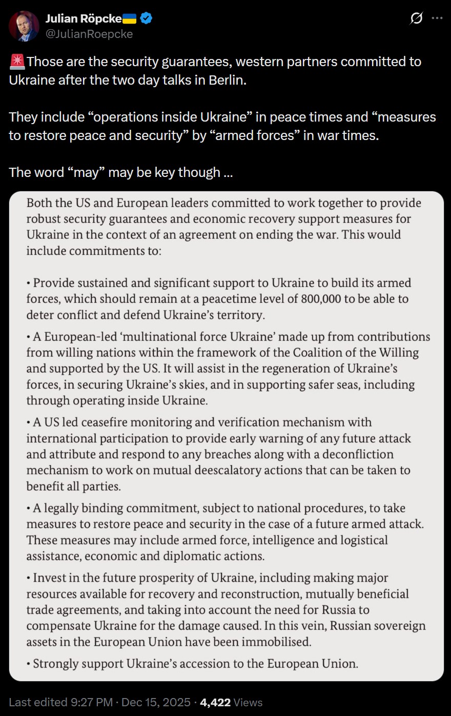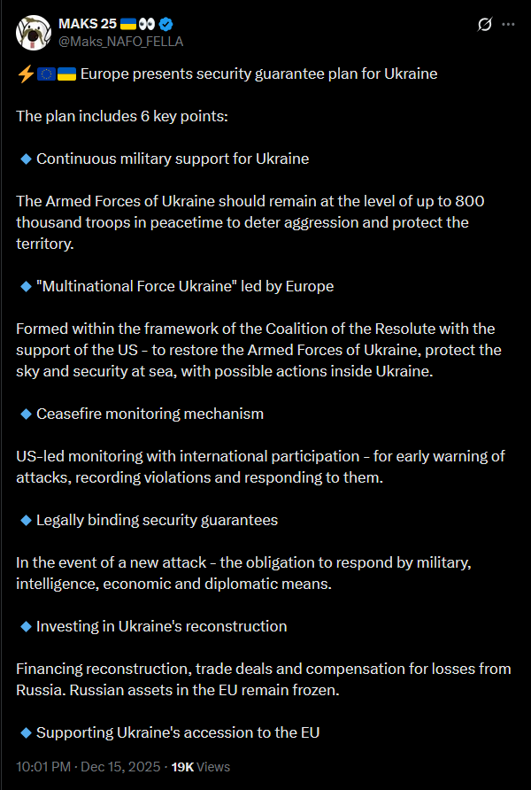 >Multinational forces "Ukraine" under European leadership. They are formed within the framework of the Coalition of the Willing with US support - for restoring the AFU, protecting the airspace and maritime security, with possible actions within Ukraine.