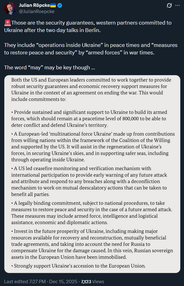 >Legally binding security guarantees. In the event of a new attack - the obligation to respond with military, intelligence, economic and diplomatic measures.