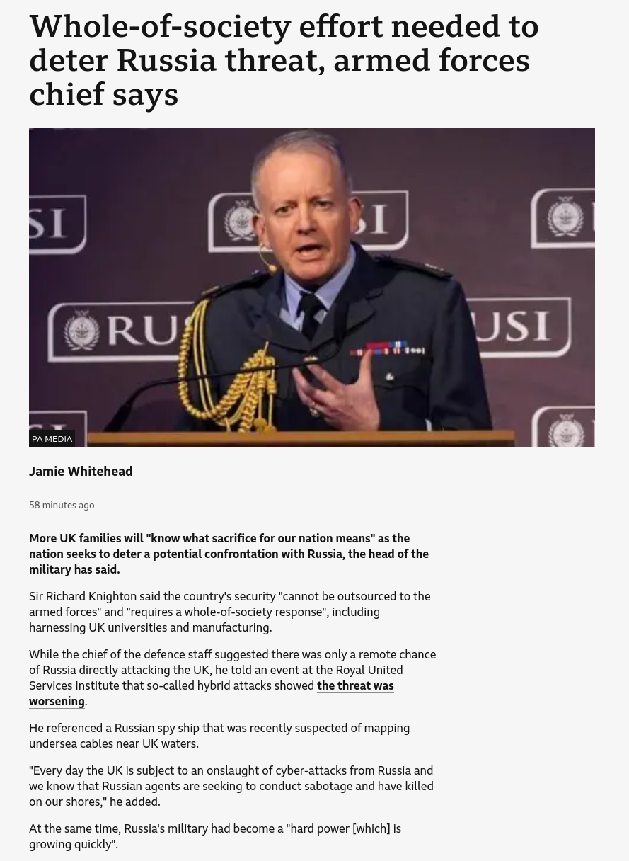 >>523660849People were eager to do whatever mad shit the government asked of them during Covid. You even had curtain twitchers snitching on their neighbours for holding illegal gatherings of more than 3 people. I have absolutely no doubt that the public would play ball again if conscriptions started, no matter how half-arsed the propaganda about Putler.