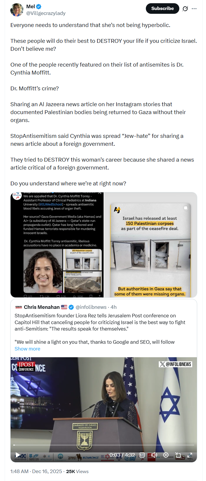 https://xcancel.com/SuppressedNws1/status/2000180705133752796#m>Footage of Eli Schlanger, the Chabad Emissary who was just killed at Bondi beach, Australia, raising Australian funds for the Israeli army, while posting from the Israeli settlement of Peduel, on October 23, 2023:>"Can you imagine if this (West Bank settlement) was in the hands of the Arabs? This is why it needs to be in the hands of the Jewish People. Because of the security and obviously because it belongs to us, because it is our land."lol