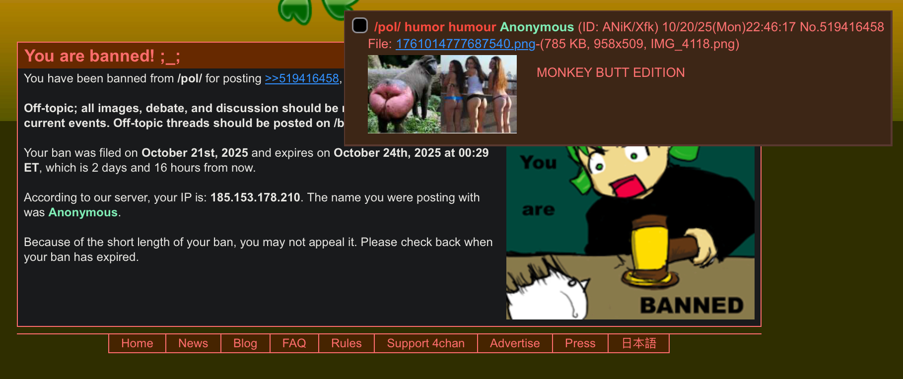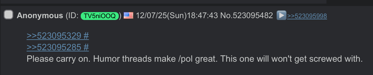>>523659062I regret being banned by some new Jannie for starting a /pol/ humor thread.
