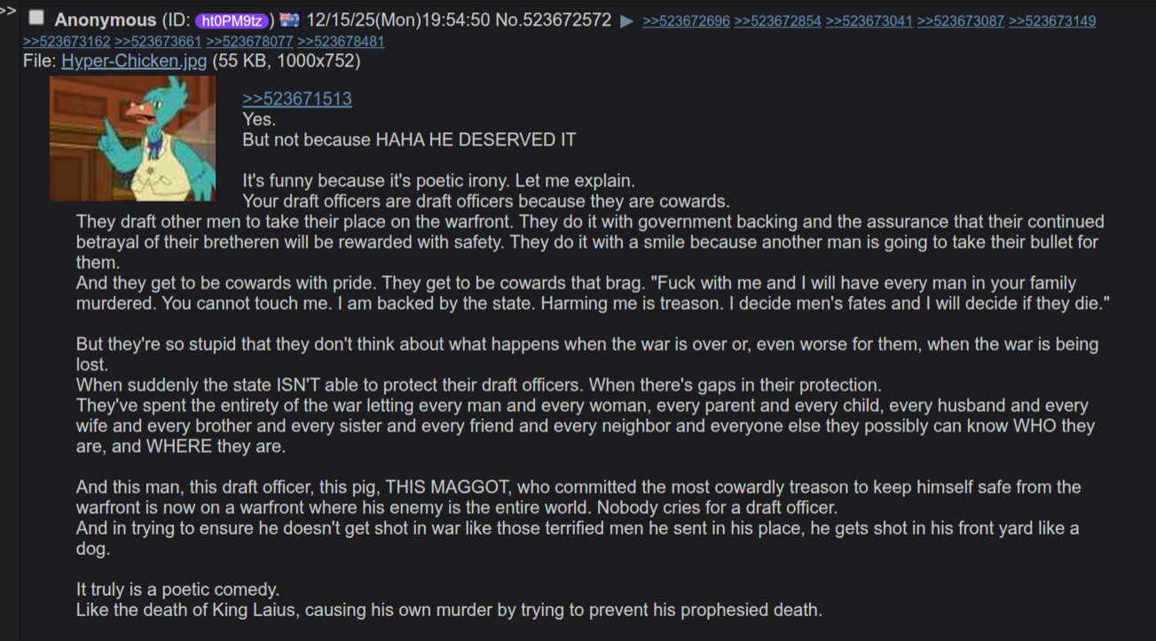>>523671513Yes.But not because HAHA HE DESERVED ITIt's funny because it's poetic irony. Let me explain.Your draft officers are draft officers because they are cowards.They draft other men to take their place on the warfront. They do it with government backing and the assurance that their continued betrayal of their bretheren will be rewarded with safety. They do it with a smile because another man is going to take their bullet for them.And they get to be cowards with pride. They get to be cowards that brag. "Fuck with me and I will have every man in your family murdered. You cannot touch me. I am backed by the state. Harming me is treason. I decide men's fates and I will decide if they die."But they're so stupid that they don't think about what happens when the war is over or, even worse for them, when the war is being lost.When suddenly the state ISN'T able to protect their draft officers. When there's gaps in their protection.They've spent the entirety of the war letting every man and every woman, every parent and every child, every husband and every wife and every brother and every sister and every friend and every neighbor and everyone else they possibly can know WHO they are, and WHERE they are.And this man, this draft officer, this pig, THIS MAGGOT, who committed the most cowardly treason to keep himself safe from the warfront is now on a warfront where his enemy is the entire world. Nobody cries for a draft officer.And in trying to ensure he doesn't get shot in war like those terrified men he sent in his place, he gets shot in his front yard like a dog.It truly is a poetic comedy.Like the death of King Laius, causing his own murder by trying to prevent his prophesied death.