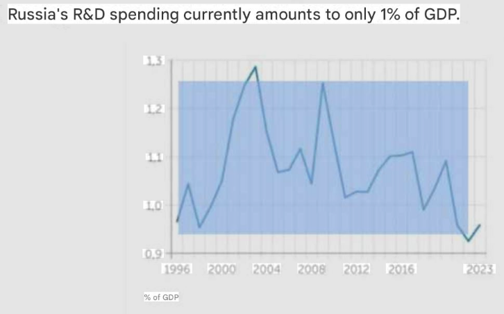 >According to Klepach's report, last year less than 1% of GDP was allocated to R&D in the country. In the pre-war years, this figure was between 1% of GDP and 1.1% of GDP, and at its peak, in the mid-2000s, it reached 1.3% of GDP. Since then, funding for scientific development has decreased by a quarter, and its current levels are even lower than the values of the 1990s, when the country was dealing with the consequences of the bankruptcy of the USSR with hyperinflation and the shutdown of entire sectors of the economy.