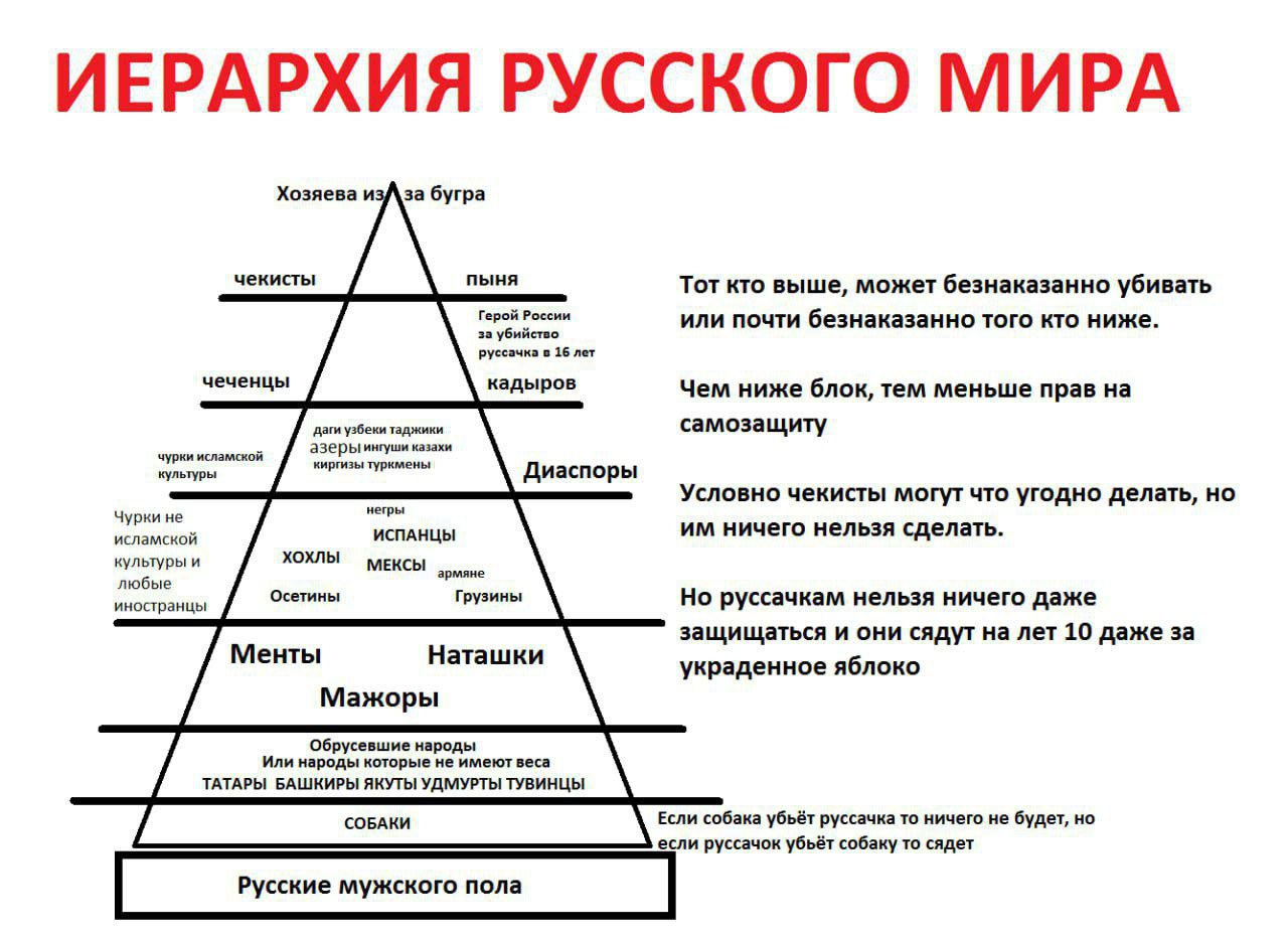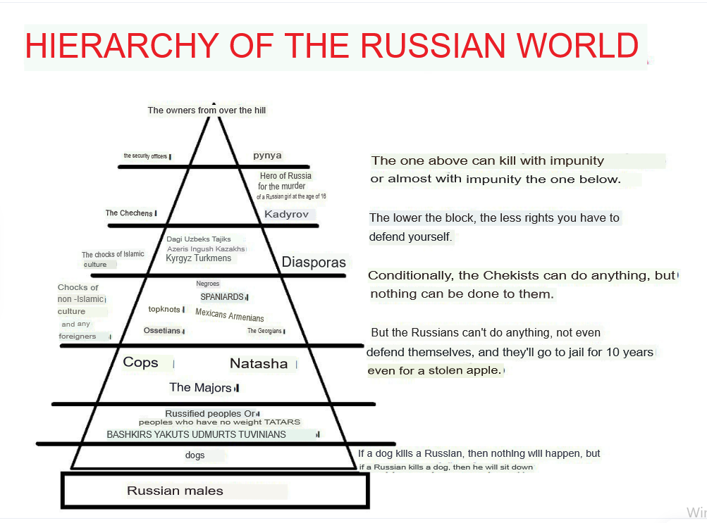 Owners from abroad -> glowniggers and Putin -> chechens and Kadyrov -> muslim migrants and diasporas -> non muslims foreigners and not muslim migrants -> Police, women, rich youth -> not russian native minorities -> dogs -> russian men