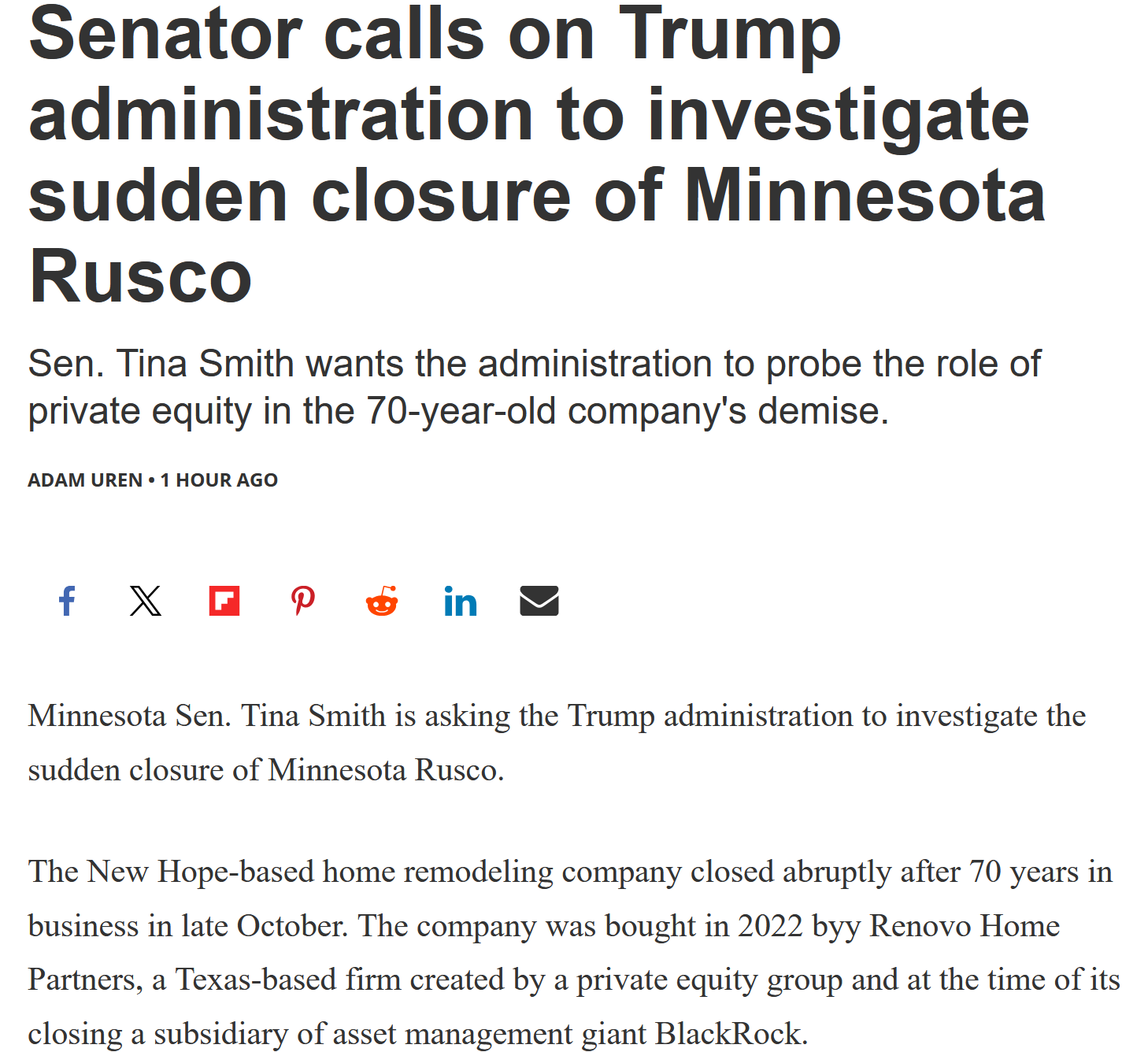 >one of the Senators from my Best Comfy Midwest State wants Blimpf and that useless bubbleheaded cunt AG of his to investigate the bankruptcy of Minnesota RuscoYeah, good luck with that...I'm sure that cunt will get right on it, a company purchased three years ago by the hedgies from BlackRock