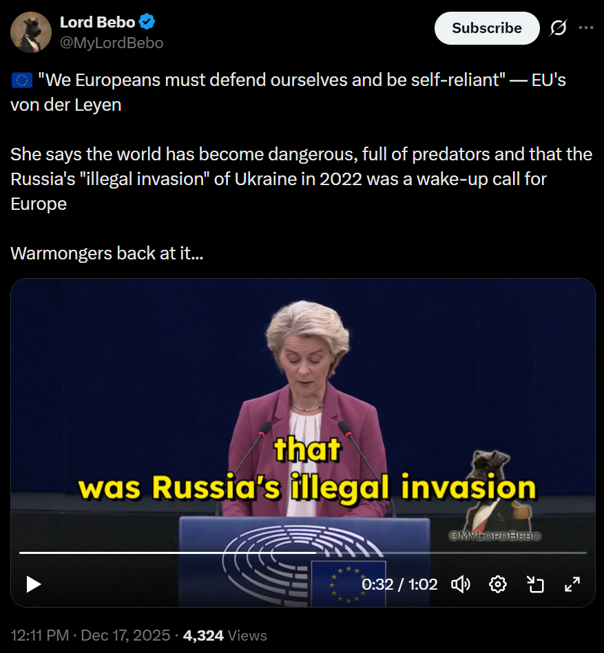 >"We Europeans must defend ourselves and be self-reliant" — EU's von der Leyen>She says the world has become dangerous, full of predators and that the Russia's "illegal invasion" of Ukraine in 2022 was a wake-up call for Europe