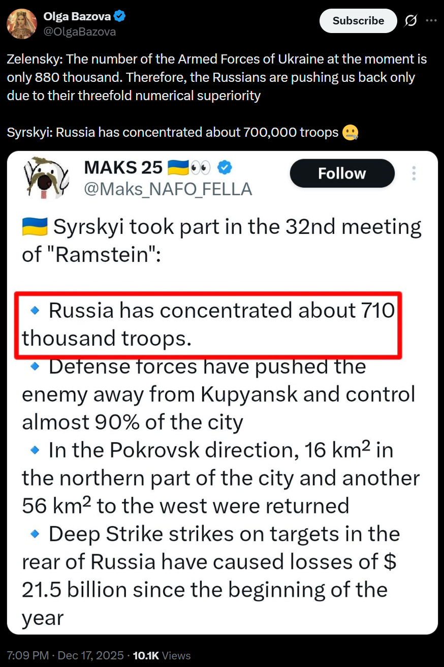 >Zelensky: The number of the Armed Forces of Ukraine at the moment is only 880 thousand. Therefore, the Russians are pushing us back only due to their threefold numerical superiority>Syrskyi: Russia has concentrated about 700,000 troops