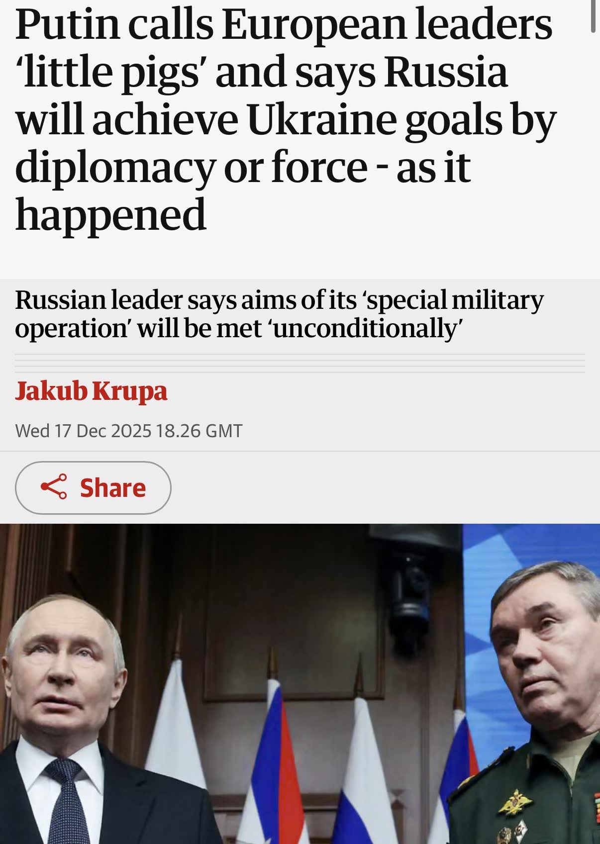 ...Copy-pasting a freebie 17-December-2025 top news & updates from the “Meanwhile in Ukraine” patreon-page:> www.patreon.com/meanwhileinukraine> www.buymeacoffee.com/meaninuak> www.ko-fi.com/meanwhileinua• Ukraine’s Defense & Military Developments (1/2)>>> Commander-in-Chief Oleksandr Syrskyi said Ukraine’s deep-strike campaign against targets inside Russia has inflicted more than $21.5 billion in losses since the start of the year, framing the effort as a way to erode Moscow’s logistics, fuel supply chains, and ability to sustain offensive operations.>>> Oleksandr Syrskyi reported that Ukrainian forces pushed Russian troops away from Kupyansk and now control almost 90% of the city, signaling that Russia’s information claims about “capturing” the area do not match the current tactical picture on the ground.>>> Commander-in-Chief Syrskyi said Ukrainian defenders regained 56 square kilometers west of Pokrovsk and another 16 square kilometers in the northern sector of the Pokrovsk direction, describing the shift as a concrete rollback of Russian pressure on a key Donetsk-region axis.>>> Ukraine’s General Staff confirmed that Ukrainian strike drones hit the Slavyansky oil refinery near Sloviansk-na-Kubani in Russia’s Krasnodar Krai at a range of more than 400 kilometers, targeting a facility tied to fuel supply for Russian forces.>>> Ukrainian strikes also hit the Nikolaevskaya oil depot in Russia’s Rostov Region, damaging a tank and a river vessel named Captain Gibert, while a separate strike hit an invaders’ field artillery depot in the Luhansk region using FP-2 strike drones.