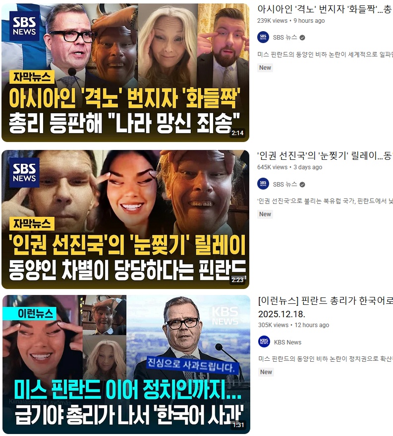 >>523845384The comments in those videos are much more hateful than Japanese comments on the issue. Japanese just seethe about discrimination and human rights hypocricy, but in the comments lot of Koreans wishing Russia to bomb Finland.You seem to be even more insecure about your eyes than Japs :D