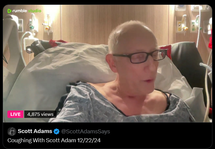Dilbert man is live streaming on his death bedhttps://x.com/ScottAdamsSays/status/2001671828687982614