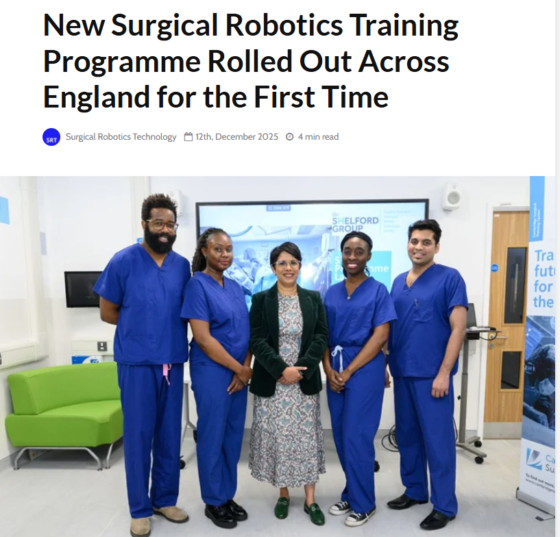 SourceThe Shelford Group has launched the Shelford Surgical Training in Advanced Robotic Technology (START) programme, which aims to deliver comprehensive surgical robotics training across multiple platforms to trainees across the country for the first time, starting with the North West, North East and East of England regions.https://www.surgicalroboticstechnology.com/news/new-surgical-robotics-training-programme-rolled-out-across-england-for-the-first-time/