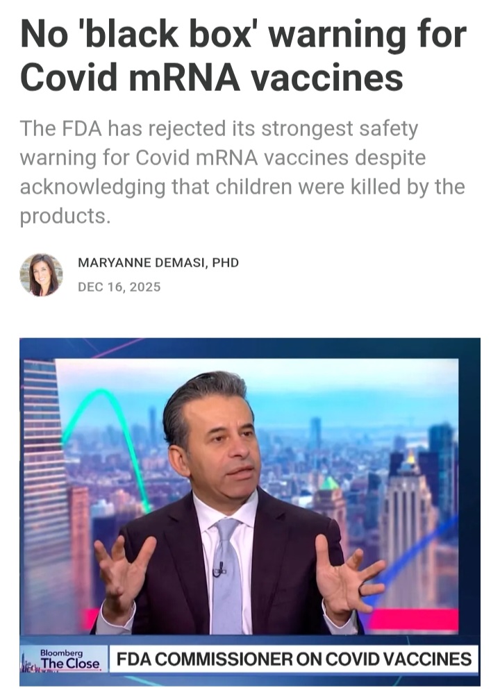 >Last Friday, the FDA said it would likely place a black box warning on Covid-19 mRNA vaccines. Now, in a STUNNING reversal, the FDA says it will NOT issue such a warning, despite its own safety committee advising to do so.https://x.com/BusyDrT/status/2001361717499134434Why do people still believe that Trump administration is some kind of opposition to depopulation agenda? It is most irrational attitude possible. Trump himself is personally responsible for the biowarfare against humankind codenamed Operation Warp Speed so why would he change anything? It is first US administration _totally_ influenced by big-tech moguls such as Gates, Musk etc, who were main pushers of modRNA/LNP against humankind for over a decade and most interested in culling people and replacing them with machines xD