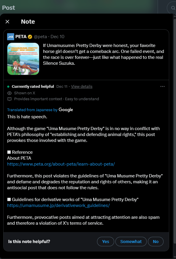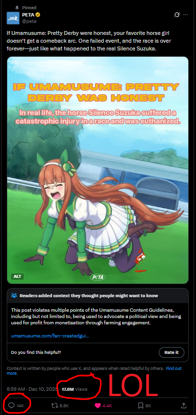Gachafags tried to cancel PETA and failed. Despite mass reporting and spamming calls to sue, the post that hurt their feelings is still up after 8 days. X didn't cave to the mob and Cygames didn't do shit. Why did gachafags think their tactics would work on Americans? Discuss the political implications.