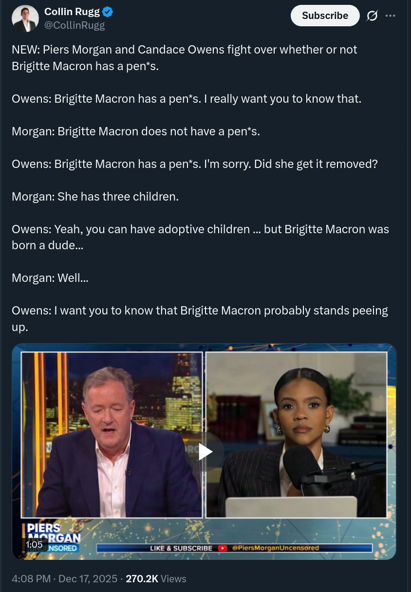 Why do rightoids love conspiracyslop so much? How does any of these matter? Candace really has like 60% of Republicans arguing over whether the wife of the president of Frances has a penis or not.you people are so ridiculous