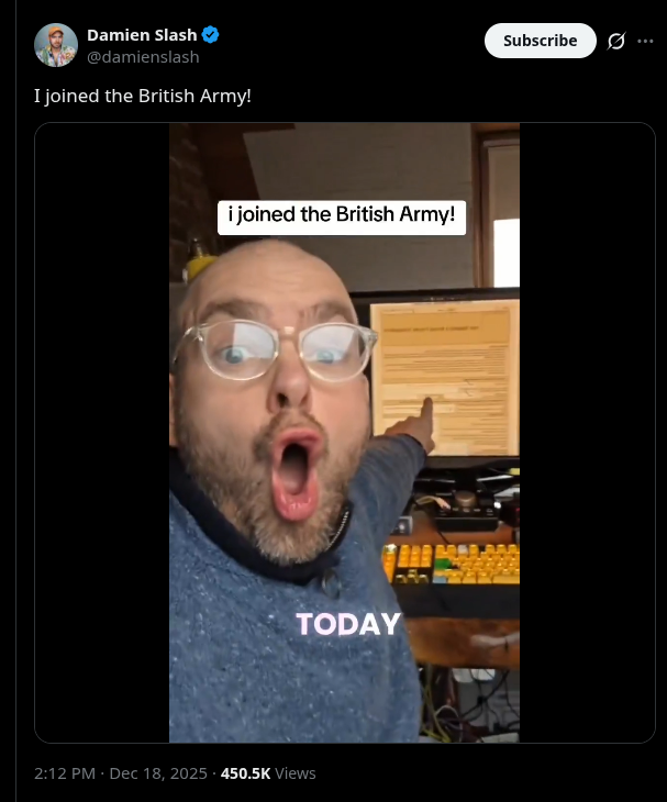 söyjak bongs are joining the uk army en masse, it's over for Russia>https://x.com/damienslash/status/2001641711609717185