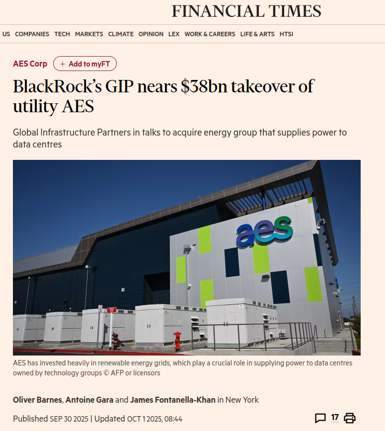 ELECTRICITY RATES WILL SKYROCKETYOU WILL BE DENIED ELECTRICITY UNDER THE GUISE OF AI>BlackRock-owned Global Infrastructure Partners is nearing a $38bn deal to buy utility group AES in what would be one of the largest infrastructure takeovers of all time, said people briefed on the matter.>As the energy needed for artificial intelligence fuels an uptick in power demand, large infrastructure funds have seized on the need for more data centre capacity. Companies such as Meta and Oracle are also working on their own debt-financed data centre projects. >GIP, which BlackRock acquired last year for $12.5bn, now manages nearly $200bn in assets worldwide, making it one of the largest specialised infrastructure investment groups globally.>GIP has a history with the utility sector. Last year, it struck a $6.2bn deal to take public utility company Allete private. Allete owns Minnesota Power