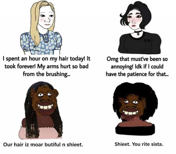 >>523871062the image is funny bc black hair does need hours of care to look good, which is why most black women cut it off completely and wear wigs. I found that out a few months ago. Thats why you can find hundreds of videos of black women at dates or weddings and they their wig gets stuck on something and drops of.