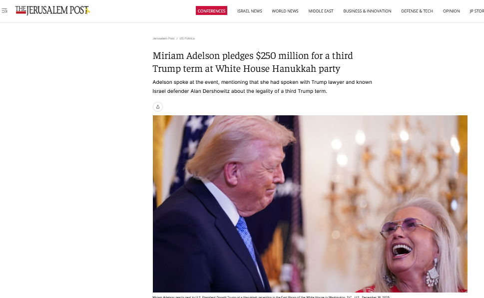 israeli- american Miriam Adelson pledges $250 million for a third Trump term at White House Hanukkah party the libs are going to fucking SEETHE. saltminer bros..we won