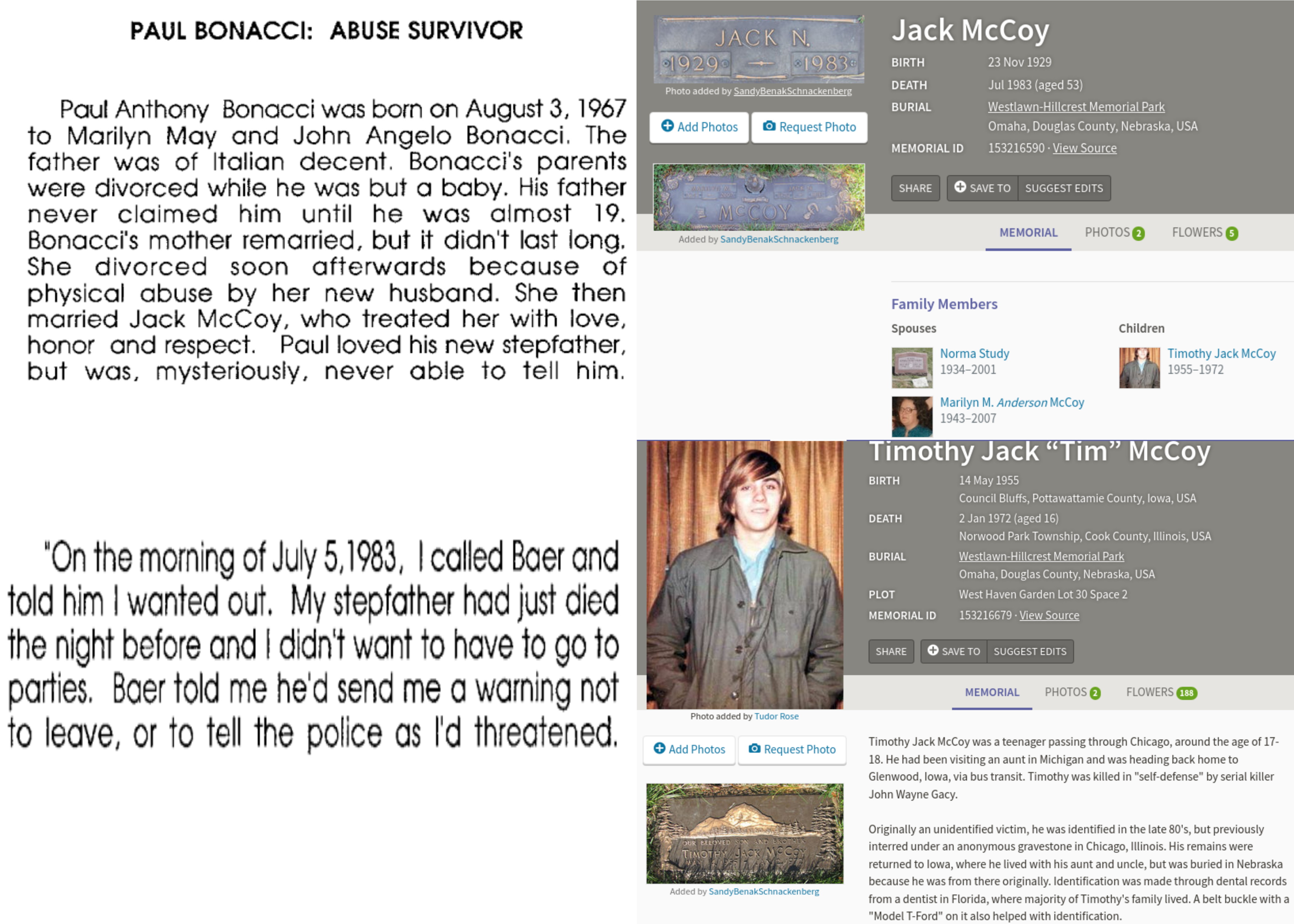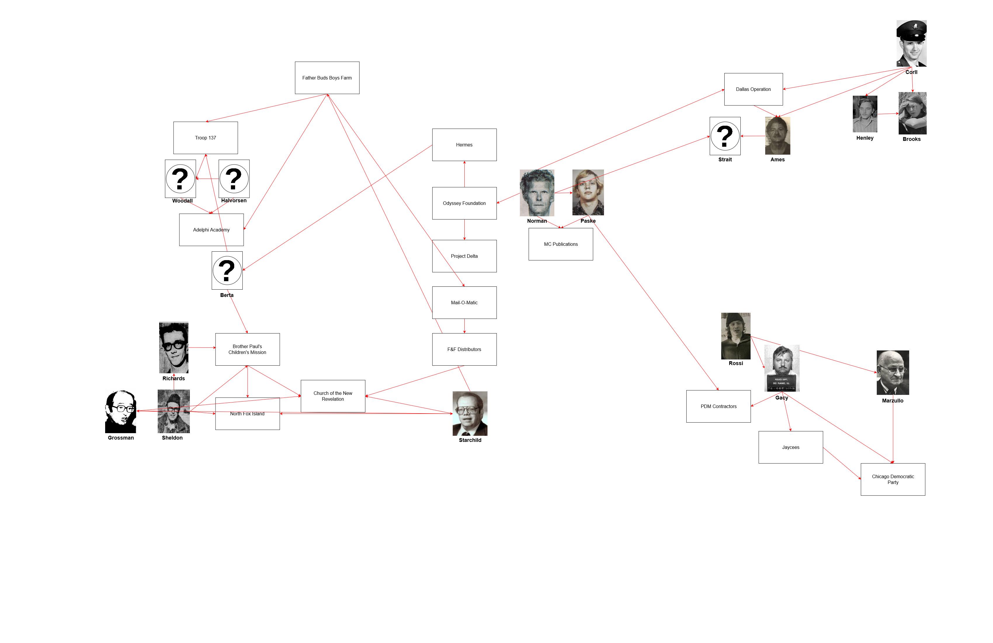 >>523882721Lawrence E. "Larry" King Jr. and Michael Aquino are missing in this chart. Paul Bonacci's half-brother was Timothy Jack McCoy. Timothy was the first known victim of John Wayne Gacy. Paul Bonacci was a victim in the Franklin Scandal case who testified to a lifetime of extreme childhood abuse by pedophiles/satanic cultists including neighbours, prominent citizens including business leaders and politicians, and military officers at the local air force base. He also claimed this pedophile ring had flown him to various cities, including Chicago where he'd lived with a schoolteacher who was part of a nationwide pedophile circuit that had a database of members on index cards. Many key elements of Bonacci's story are either verified or corroborated, and he had made these disclosures to school counselors years before Franklin surfaced. >John David NormanCoincidentally, he owned of the apartment at 223 South Ewing Avenue, Dallas, TX where Jack Ruby lived. On November 13, 1962, Ruby moves into the 223 South Ewing Street property. He makes out a $40 deposit, and the slip is signed by John D. Norman. This comes from a report tracking Ruby's movements and their association with the mob.