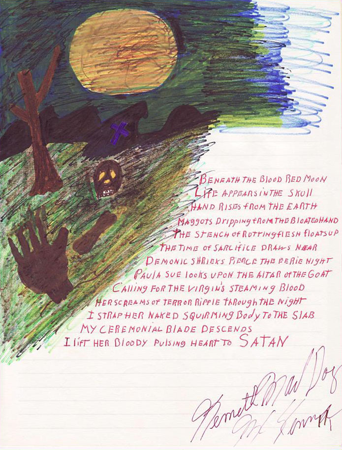 >>523896405>She and her two coven sisters had gone to this evangelical session and had their demons cast out. I had them taken out to the Green Swamp and crucified. It took me about 30 seconds to decide what to do. Can you imagine the problem I would have had if those twits had been turned loose? Same with this Molly bitch. She wasn't going anywhere but into the belly of the community swine. I don't want to get into the details. I had her killed and that's that. Betray me and die. Molly just never realized that I meant business. I always mean business. I'm the Mad Dog! Molly was always bugging me about visiting Rancho Diablo. She got her wish; she's a permament resident down there right now. Forward her mail to "The Cave of Skulls"! Hail Satan!>GJ - Mad Dog, I've heard that a Fourth Prince has the ability to see into the future, is that true?>MD - Yes, I do it all the time. I cast runes. I have them here in my pocket. I can cast them anywhere>GJ - I believe that the FATAL VISIONS readers would like to have a prediction concerning the soon to be tried "Student Murders" case in the City of Gainesville, Florida. Can the runes tell us who did it and what will happen to the killer? This would verify your powers if you could actually cast a prediction in this case>MD - I can do it easily. Watch.>(Mad Dog unties the rune sticks. These are 13 unpolished sticks of varied colors. Now he casts the runes onto the floor. They appear to be in a jumble. Mad Dog kneels over the runes. He gasps, sucks in his breath and says)>MD - Death runes! Death! Death! Death! Death and ruin! This is a horrible things. I've never seen such bleakness. Oh, Oh, Oh, a vision!>(Mad Dog's eyes roll back in his head and from his trancelike state he recites...)>MD - Death. Death. Death. Death. Death. Innocent blood cries out from the earth. Our spirits are unsettled. We have no peace. Danny Rolling killed us. Our blood calls from the earth. We will be avenged. Rolling is the killer