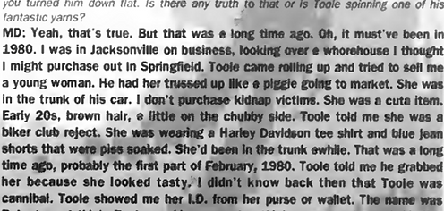 >>523889510For those who are not familiar with this, the book "Hand of Death" by Max Call recounts the story of Henry Lee Lucas, a serial killer who told authorities he was a hit man for a alleged politically connected satanic cult. Lucas indicates he was told Lee Harvey Oswald had been a member of the cult, and there are reasons to believe this:>(a) Lucas said the cult had a paramilitary training camp in the Florida Everglades, this is where CIA was operating paramilitary training camps for Cuban exiles, and former CIA agent Marita Lorenz testified under oath to seeing Oswald at one of these camps;>(b) Another Oswald friend, David Ferrie, who trained Cubans for the Bay of Pigs Invasion, allegedly told a girlfriend of Oswald's that he was connected to satanic cults and displayed a ring with a demonic face, Lucas said Hand of Death members wore rings with demonic faces;>(c) Lucas said the Hand of Death was based in Mexico, where Oswald is reported to have made a visit, still shrouded in mystery, in the fall of 1963In fact, Lucas' accomplice in the officially-acknowledged killing spree, a man named Ottis Toole, confirmed his allegations about the Hand of Death cult, providing detailed descriptions of their rituals, and telling chronicler Sondra London that he was born into a family that had been involved with black witchcraft for generations. Toole also revealed, quite interestingly, that he'd visited the Process Church of the Final Judgment in New Orleans! Following a sojourn to (you guessed it) Mexico, they arrived in the U.S. where they were incorporated in New Orleans with the assistance of attorney Tommy Baumler, who belonged to the same CIA-associated circle as Shaw, Ferrie, and Oswald, and later interviewed by the D.A.Jim Garrison's investigators in connection with the Kennedy plot. Small world, isn't it?