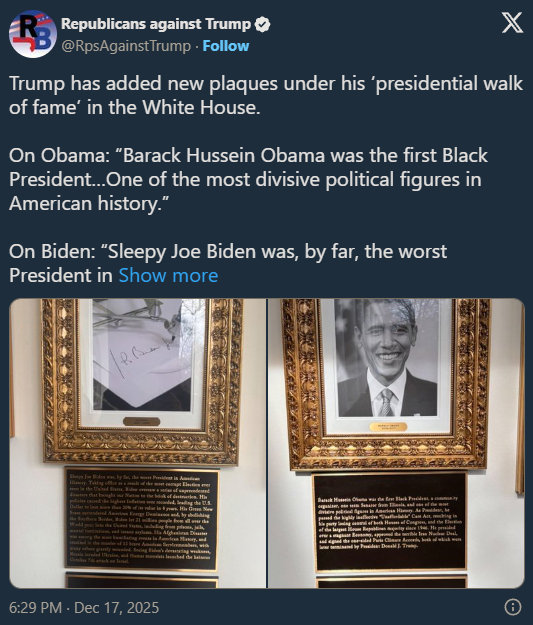 Trump has added new plaques under his ‘presidential walk of fame’ in the White House. On Obama: “Barack Hussein Obama was the first Black President…One of the most divisive political figures in American history.”On Biden: “Sleepy Joe Biden was, by far, the worst President in American History... Nicknamed both “Sleepy” and “Crooked,” Joe Biden was dominated by his Radical Left handlers.”https://x.com/RpsAgainstTrump/status/2001359063771394346