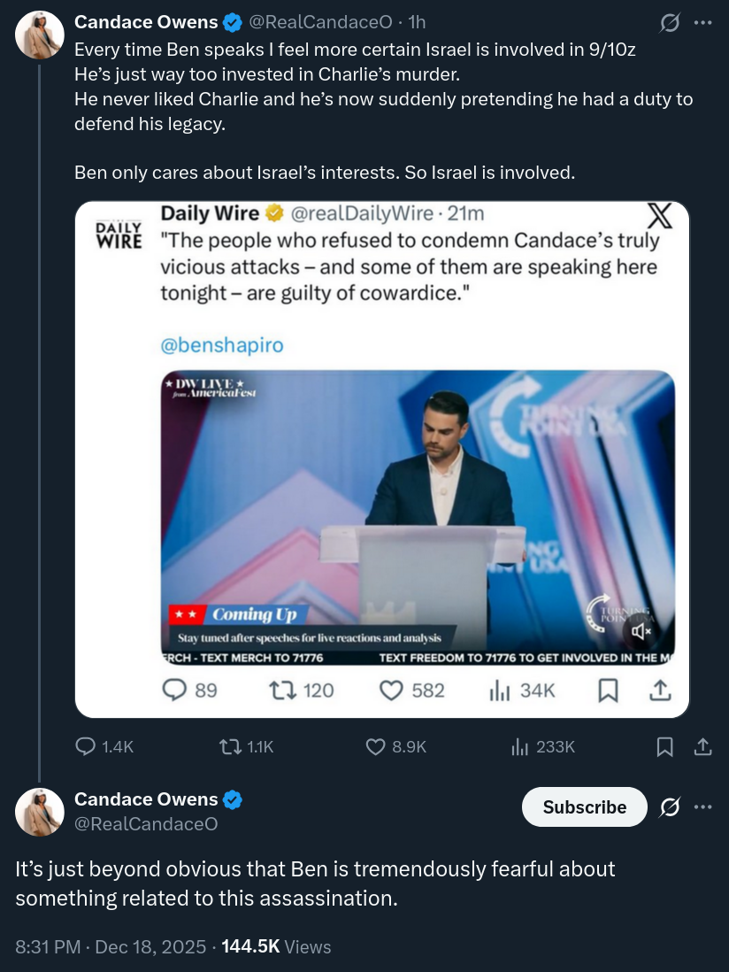Candace is correct that people such as Ben Shapiro, Bari Weiss etc. are going to continue to be a litmus test for state of Israel's direct involvement in the assassination of Kirk, the louder that they shriek.https://archive.4plebs.org/pol/thread/516802038