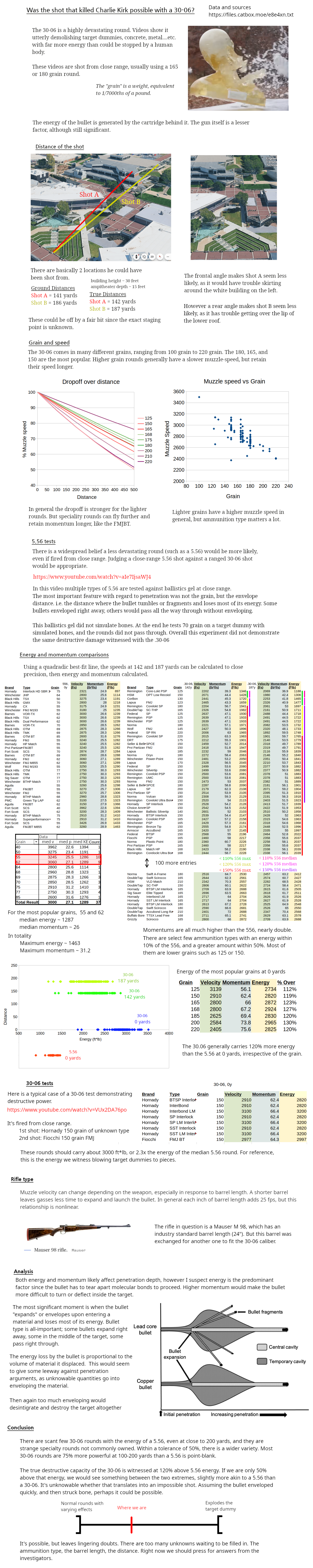 People should test these energies to find out what would be feasible. Tldr:-- there are 2 potential shooting locations-- the 556 at point blank carries 1200-1400 ft*lbs-- the .30-06 at point blank carries 2700-3100, about 2.2x greater-- the 30-06 at 142 yards carries anywhere between 1900 and 2700. There are a few strange specialty rounds that go down as low as 1300.-- the 30-06 at 187 yards carries anywhere from 1700 and 2500. Those same speciality rounds go as low as 1200Unless we're talking about those specialty rounds, the lowest energy he could have been shot with is 30%-50% greater than a standard 556 shot. People believe the 556 shot is possible, so would an energy 50% greater be? The close-range 30-06 is 120% greater energy, and that's definitely not possible.The primary conclusion is that the shot is within the realm of possibility, but it is unlikely. We need answers.