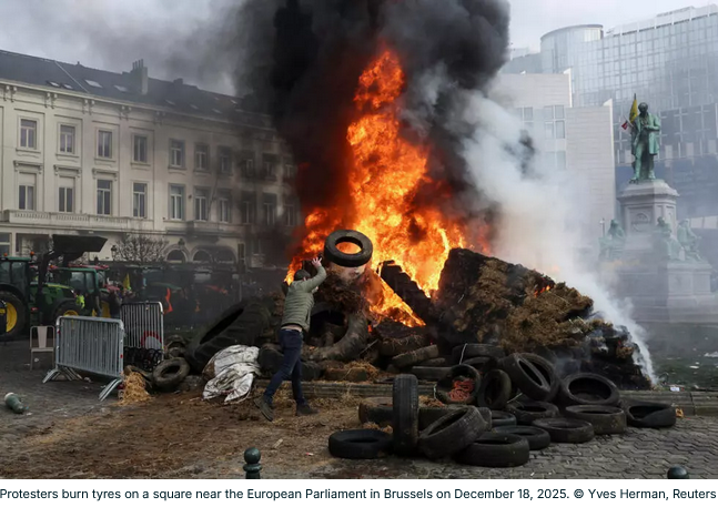 https://www.france24.com/en/europe/20251218-farmers-to-protest-the-eu-mercosur-treaty-in-brussels-as-european-leaders-meet-in-summit> About 1,000 honking tractors rolled into the Belgian capital to heap pressure on an EU leaders' summit where the deal's fate hung in the balance. What is it with elites always fighting their food providers?