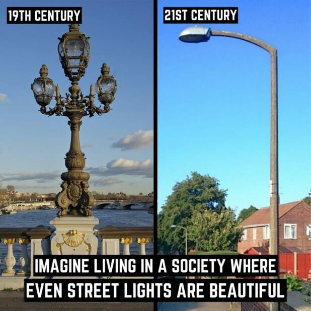 What's up with the world getting more and more uglier nowadays?Things used to be way more beautiful in the past and way more intricate and nowadays everything is so ugly, from buildings, to art, to home interior and to even simple things like lamp posts.Yeah I know it's petty to complain about but I just feel as though all these ugly and bland surroundings make us more miserable and depressed.