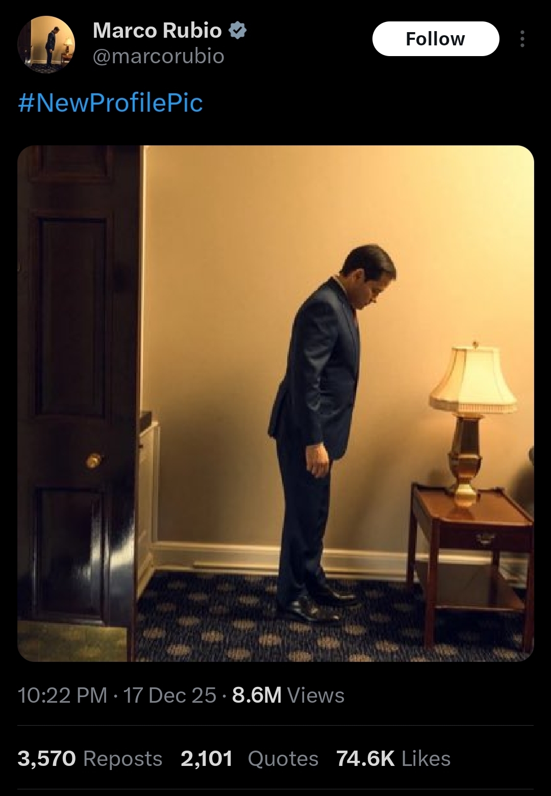 >>523909363If you read the Vanity Fair article the picture was originally taken for it was basically a humiliation ritual. Vance paid the photographer $1,000 to take the worst picture he could of Rubio, and then bullied Rubio into making it his twitter profile pic.