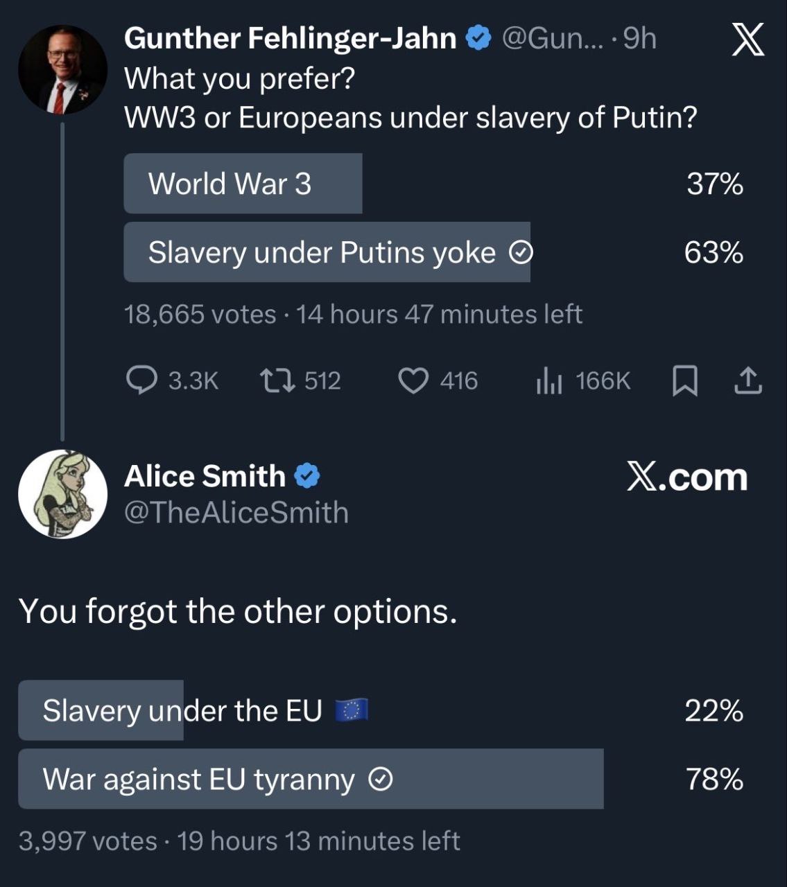 >>523910906Because West lives in totalitarian regimes and elections matter then then interparty elections in China. Election don't matter when regime only allows same choices but with different color. In practice Germn policy has not changed with the councilor, Germany just became worse over time.