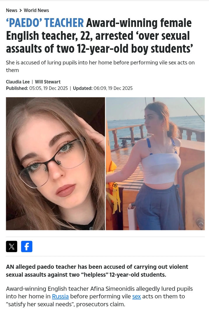 ITT: anon discovers Daily Nice and an Ivan doxxes some teacher.To be crystal clear - there is NO PROOF other than some random blog post - https://www.lindaikejisblog.com/2025/12/22-year-old-award-winning-female-english-teacher-arrested-aover-s3xual-assaults-of-two-12-year-old-boy-studentsa.html