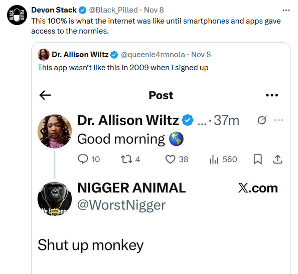 >>523917086???? Did your fucking country even have internet in 1994? i was calling absolutely everybody a nigger online in every way possible. in 1996 my clan was on 5 different games calling everyone a nigger, we had 8 year old kids and 70 year old grandpas in voice chats just laughing about how much shit they talked that day and sharing new ways to talk shit to people.Shit i'd love to go back to the old websites and forums and bullshit like Yahoo chat rooms to just shit talk randos. The future sucks ass and is gay as fuck with all it's subhuman shitskins. The internet fucking died when all the shitskins started coming online in 2002-2004.The world ended after 9/11 and we are in hell.