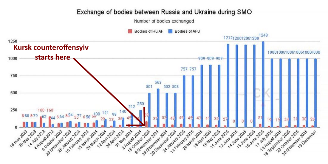 >Russia, Ukraine carry out new exchange of bodies>Kremlin aide Vladimir Medinsky said Russia had handed over to Ukraine the remains of 1,000 Ukrainian servicemen and had received the bodies of 26 Russian soldiers from Kyiv.how do ukrainians explain these weird ratios?