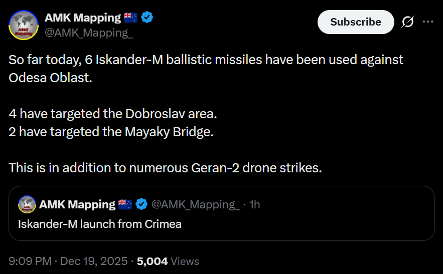 >So far today, 6 Iskander-M ballistic missiles have been used against Odesa Oblast. >4 have targeted the Dobroslav area.>2 have targeted the Mayaky Bridge.>This is in addition to numerous Geran-2 drone strikes.damn terror bombers