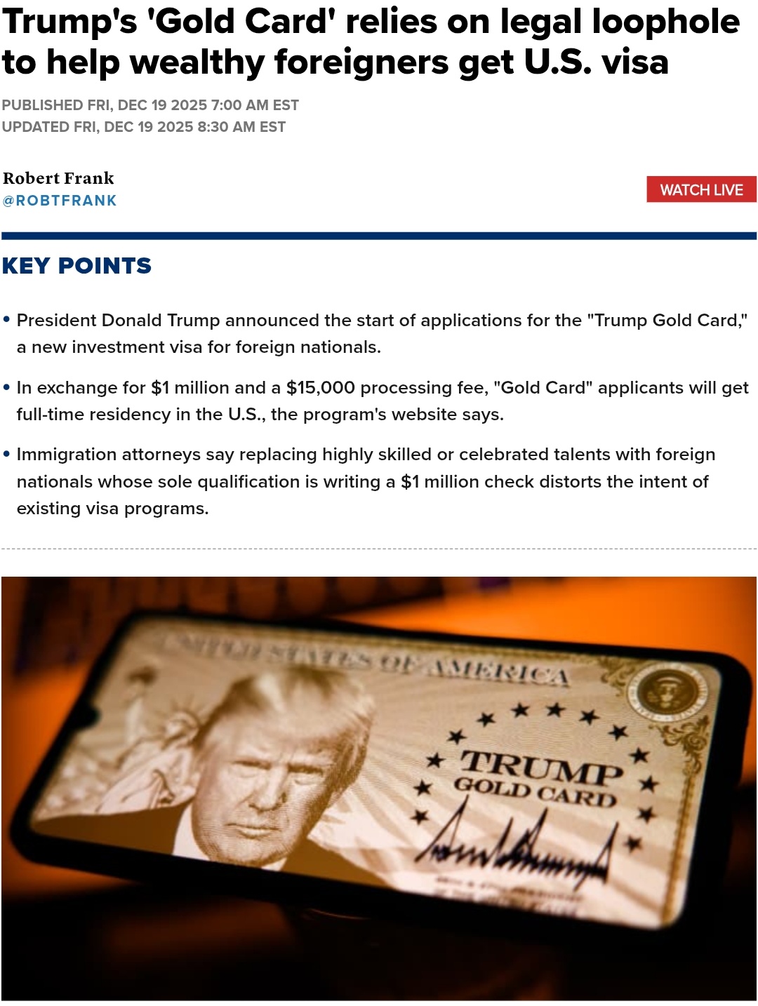 President Donald Trump's new "Gold Card" visa program uses a novel definition of wealth as a job skill to allow the overseas wealthy to bypass immigration rules and secure citizenship, according to immigration attorneyshttps://www.cnbc.com/2025/12/19/trump-gold-card-wealth-immigration-questions.html