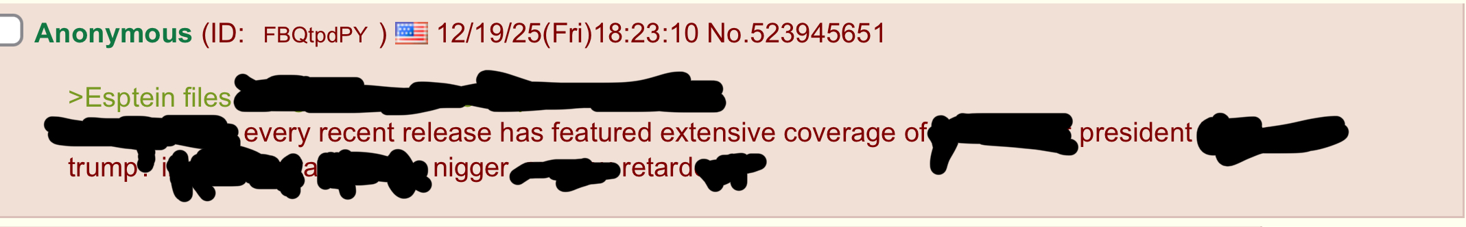 >>523945651>why every recent release has featured extensive coverage of a democrat president but never trump?are you really so stupid that you can't see why that's so weird given their 15 year long friendship and the extensive private correspondence between them?the files have extensive material on a guy that flew on the lolita express a single digit number of times but has NOTHING on Epstein's best friend and confidant? that would be like if they released the bonnie & clyde files and clyde was conspicuously missing from all the egidence