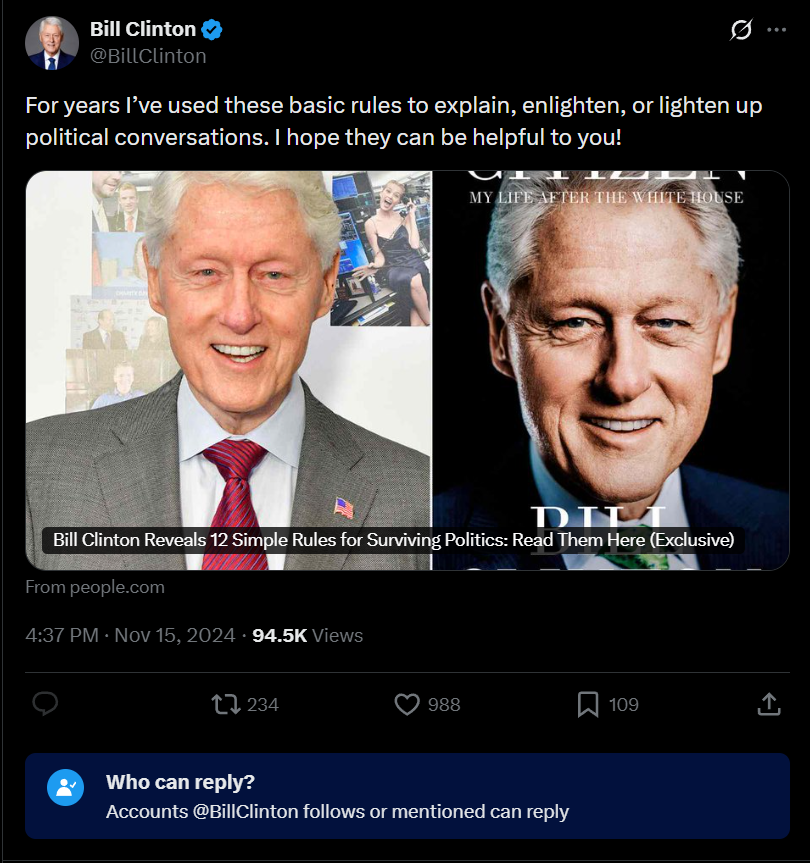 >>523946662https://x.com/BillClinton/status/1857538419427082474Look at this Tweet from over a year ago. Locked. Why?