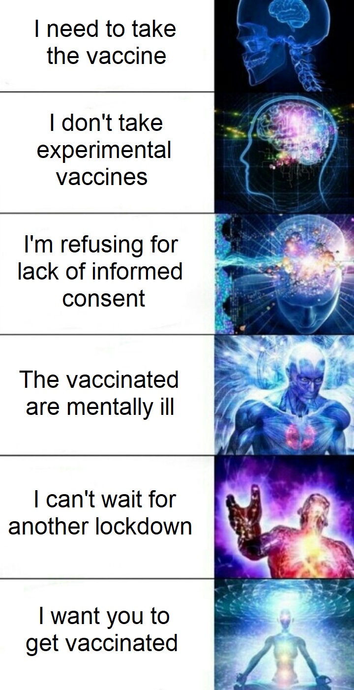 >>523950369Yeah, covid is so much worse than the vax.I had a small reaction to my first shot. Nothing much just a little bit of pain in my arm and my chest, some heart palpitations, the normal. I was lucky I got vaxed, because two days later I got covid for the first time. It was awful. Way worse than the small side effects from the vax I had.After I knew how bad covid was, I was first in line for my second shot. I was prepared for the side effects again, I knew it was worth it. Yeah, that second shot was a doozy. It put me out for three days. I couldn't walk tremors all in my legs. I forgot my cat's name. It was rough. But, I got the second shot just in time, because four days later I got the worst covid ever. I can't imagine how bad it would have been if I weren't vaxed.After all of that, I was worried about getting the booster shot. I knew I needed it, but I know all vaccines have side effects. I sucked it up and got the booster anyway. The third one was rough. I lost feeling in half my face, my hair came out in clumps, my gums were bleeding, and I could hear the voice of satan in my bathroom. But, I'm so grateful I got the booster. The next day I got covid again. My left testicle doubled in size and I lost control of my bowels and motor functions, I just constantly flail and piss myself. Turns out I have long covid. It's a nightmare.Get vaccinated people, covid is no joke