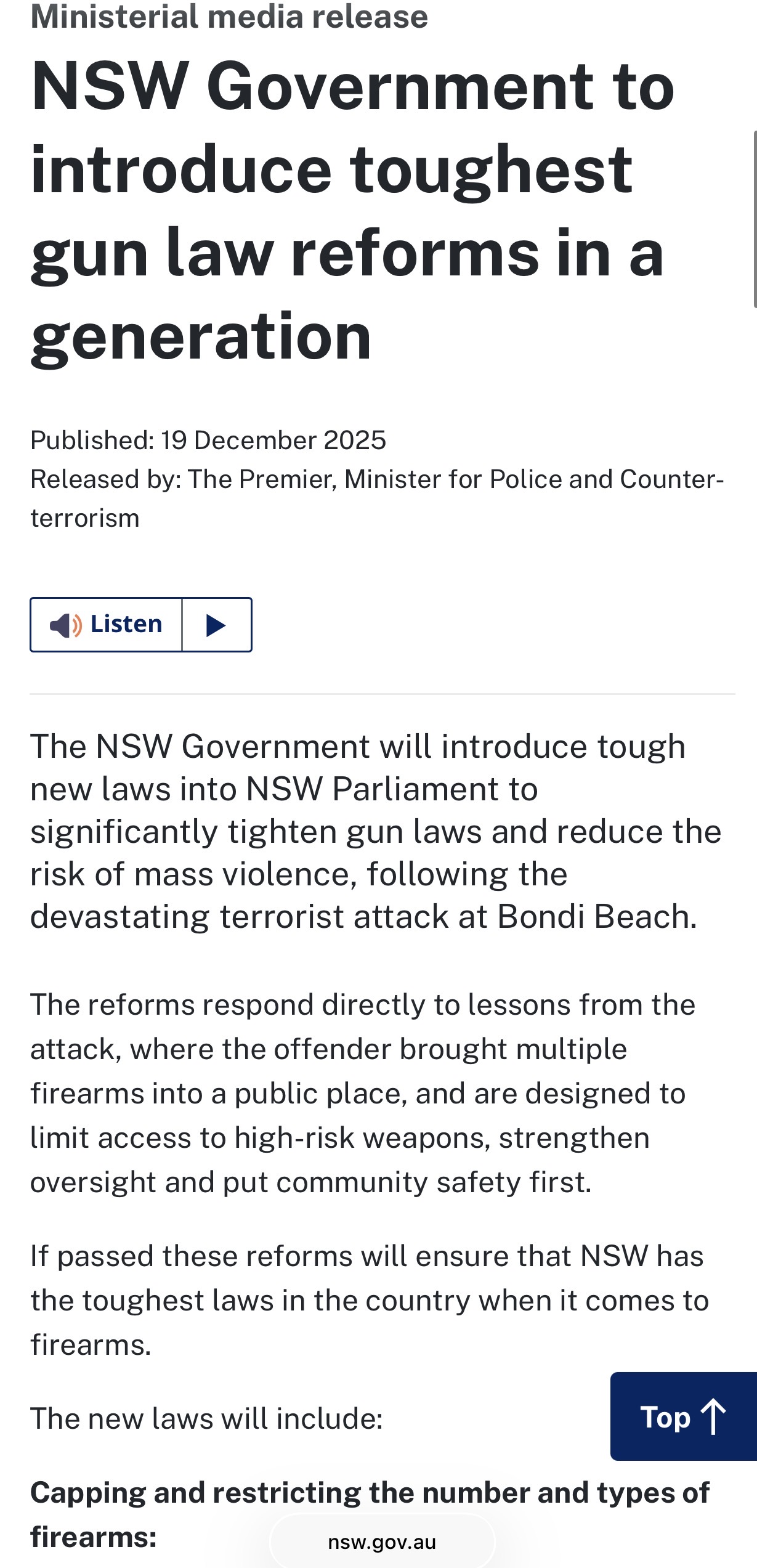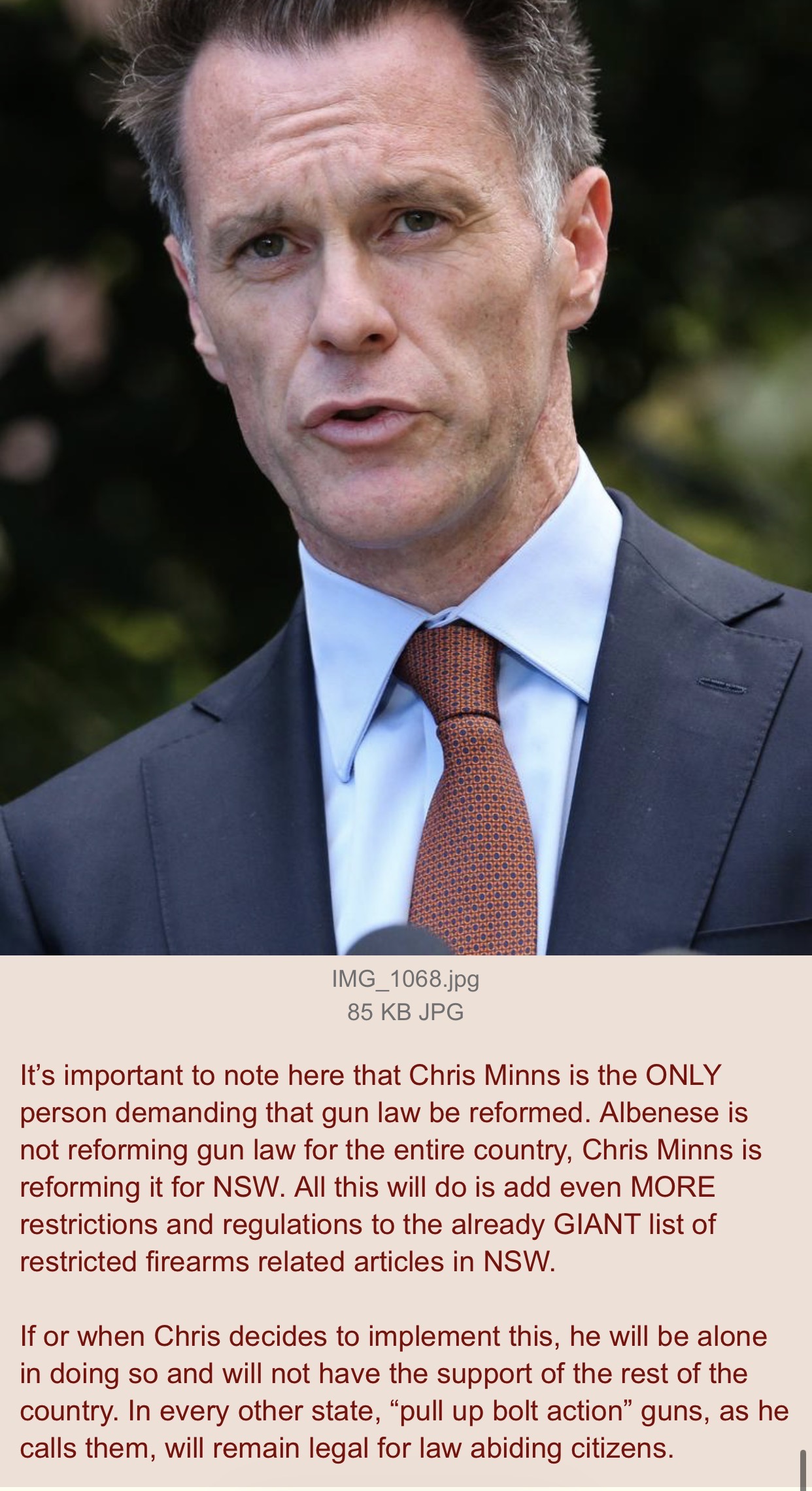 Chris Minns to start seizing firearms and potentially knives from law abiding citizens in NSW:https://www.nsw.gov.au/ministerial-releases/nsw-government-to-introduce-toughest-gun-law-reforms-a-generationThe NSW Government will introduce tough new laws into NSW Parliament to significantly tighten gun laws and reduce the risk of mass violence, following the devastating terrorist attack at Bondi Beach.The reforms respond directly to lessons from the attack, where the offender brought multiple firearms into a public place, and are designed to limit access to high-risk weapons, strengthen oversight and put community safety first.If passed these reforms will ensure that NSW has the toughest laws in the country when it comes to firearms.The new laws will include:Capping and restricting the number and types of firearms:Imposing a cap of four firearms per individual, with strict exemptions for primary producers and sports shooters, who may hold a maximum of 10 firearms.Reclassifying straight-pull/pump-action and button/lever release firearms into Category C, limiting their access primarily to primary producers.Reducing magazine capacity for Category A and B firearms to a maximum of five to ten rounds, from a current unlimted capacity.Introducing a complete ban on firearms that can use belt-fed magazines.Strengthening firearms licence checks and accountability:Removing the NSW Civil and Administrative Tribunal (NCAT) review pathway, ensuring we can use sensitive police intelligence without concern that a decision will be overturned by a tribunal, while retaining a rebust internal review process to ensure fairness and accountability.