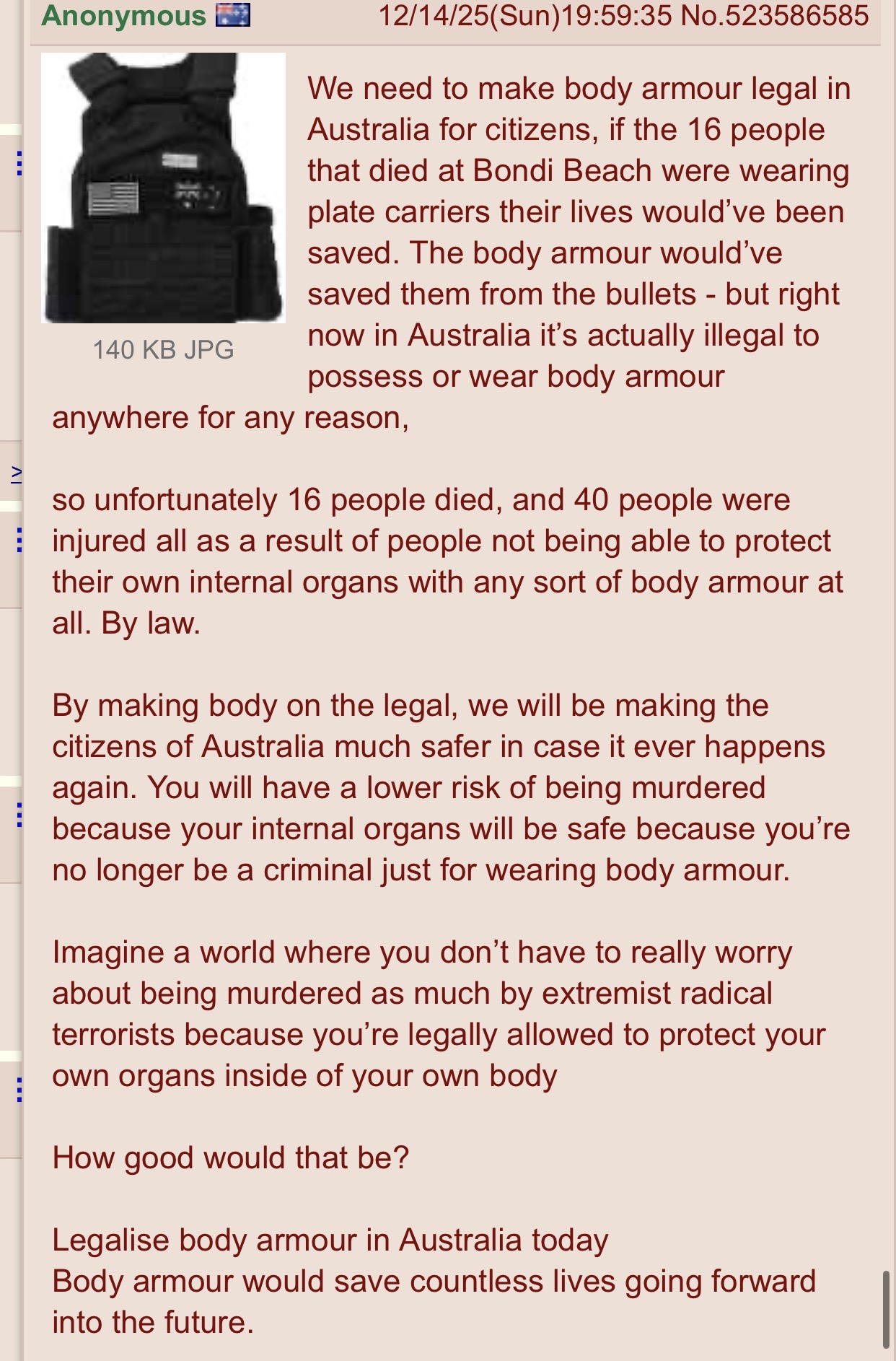 >>523956086They have no problem banning guns, but body armour will be remaining illegal,Sorry peasantsYou will own nothing and you will have no way to defend yourself and you will be happy